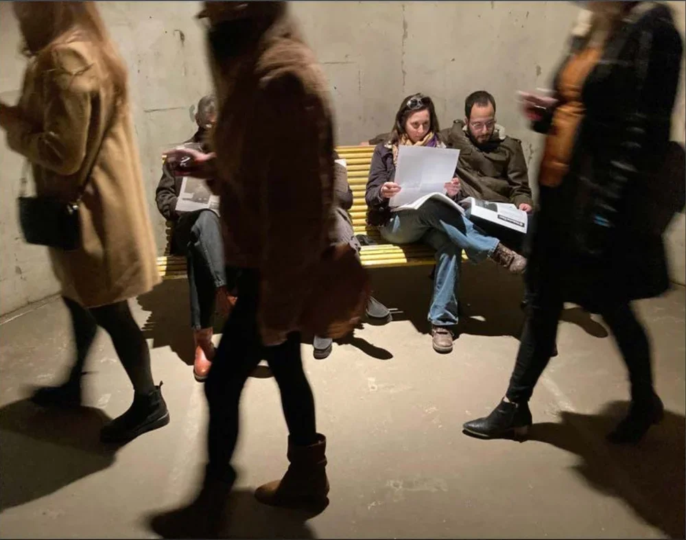 A JEW A BOOK AND A BENCH (in response to January 6 United States Capitol attack), 2022. Sitting on a Nazi Era bench, (imported from France), reading Hitler's American Model: the United States and the Making of Nazi Race Law, by James Q. Whitman. Beside me are posters with oral histories of the yellow benches Nazis installed in public spaces to segregate Jews.